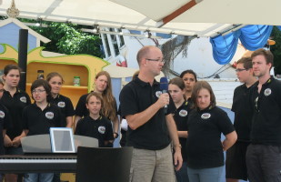 Der Chorleiter Andreas Fischer-Schmitt nutze die Zeit um noch ein paar Informationen zu verteilen.