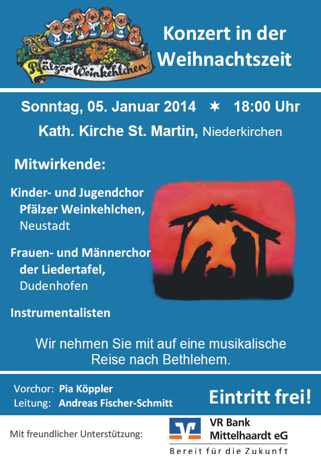 Auf eine musikalische Reise nach Bethlehem lädt der Kinderchor „Pfälzer Weinkehlchen“ für Sonntag, 5. Januar 2014, um 18 Uhr in die Katholische Kirche St. Martin Niederkirchen ein.