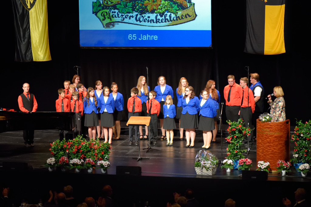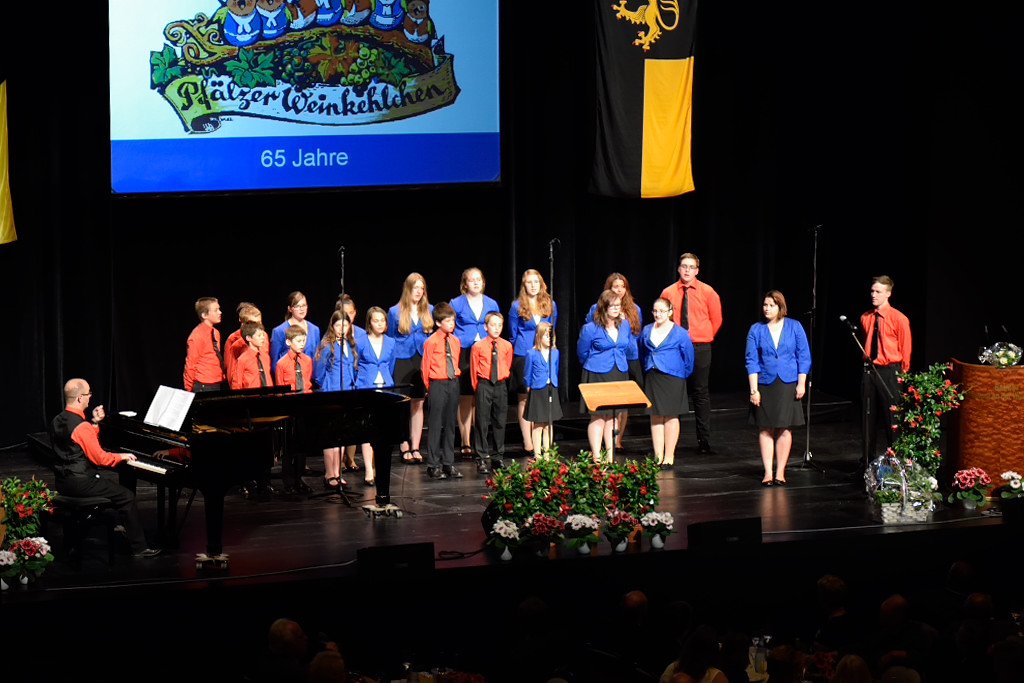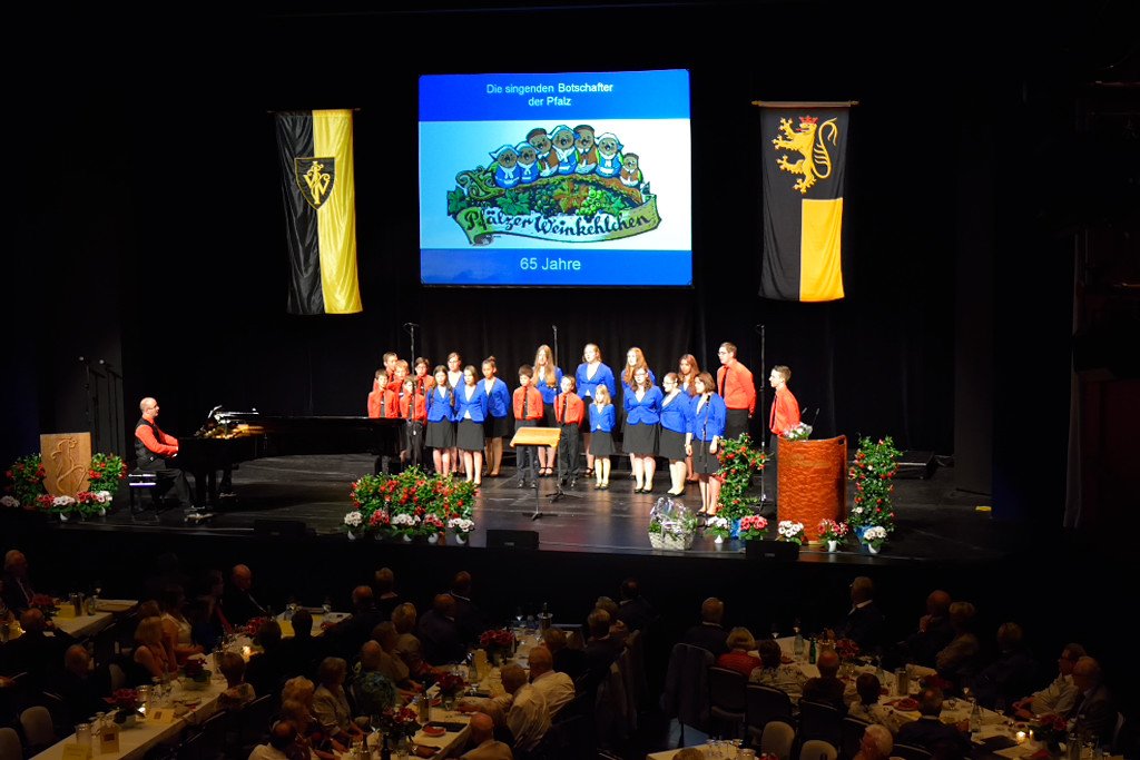 Bei ihrer Literarisch, musikalische Weinstunde feierte die Weinbruderschaft der Pfalz ihren 60. Geburtstag. Um ihren Paten zu gratulieren eröfnete der Kinderchor zusammen mit den WWWs und dem Chor der Ehemaligen Weinkehlchen den Abend mit dem Weinkehlchenlied.