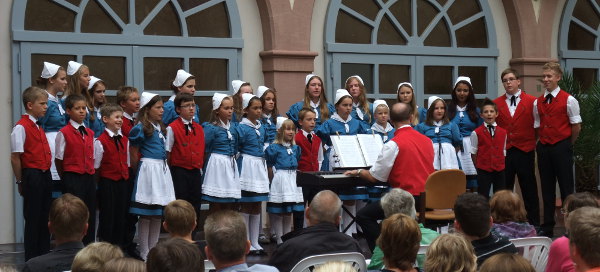 Die Kinder müssen sich jetzt beeilen, die Tracht anziehen und auf die Bühne zum einsingen. Währenddessen sind die Helfer damit beschäftigt alles aufzubauen und die Stühle zu trocknen. Und die ersten Gäste kommen schon.