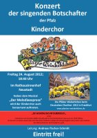 Zurück aus dem Sommer-Ferienlager in Wolfstein im Kreis Kusel bringt sich der Kinderchor „Pfälzer Weinkehlchen“ auch in seiner Heimat Neustadt wieder in Erinnerung: Am Freitag, 24. August, laden die „Singenden Botschafter der Pfalz“ ab 18:30 Uhr in den Innenhof des Rathauses zur Sommer-Serenade ein. Chorleiter Andreas Fischer-Schmitt hat dafür unter anderem mit den Kindern ein Musical einstudiert.