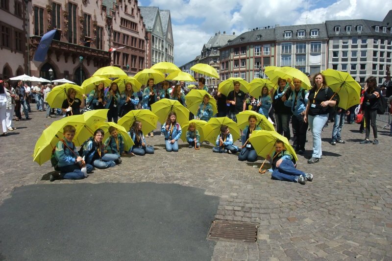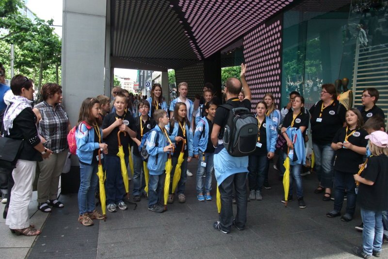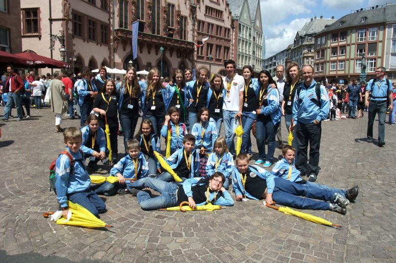 Mit der Bahn ging es von Neustadt Böbig über Mannheim nach Frankfurt. Nach einen Fußmarsch am Mainufer entlang kamen sie kurz nach 9:00 Uhr in der Jugendherberge an. Dort trafen sich die Kinder- und Jugendchöre zum Einsingen bei Herrn Steffen Utech. Von dort aus zogen die Chöre gemeinsam zum Römer.