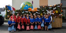 Der diesjährige Motivwagen zeigte die Orte an denen die Pfälzer Weinkehlchen schon gewesen waren. Oben auf der Weltkugel waren die verschiedenen Länder zu sehen in denen der Chor schon zu gast waren.